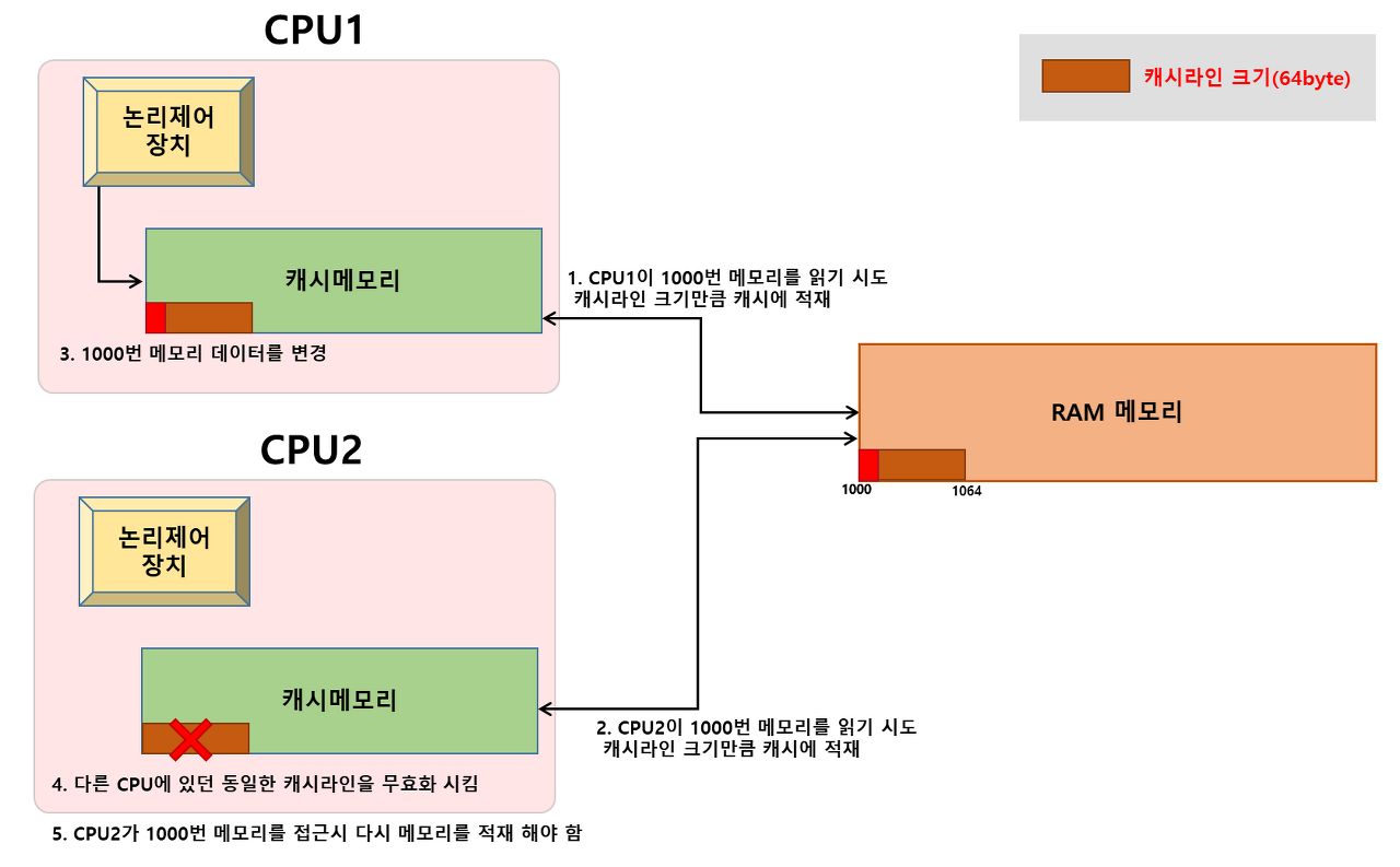 [4] CPU1 이 1000번 주소의 데이터를 변경함과 동시에 다른 CPU에 있던 1000~1063 캐시라인 전체를 무효화합니다. 캐시 라인 전체가 갱신됩니다.