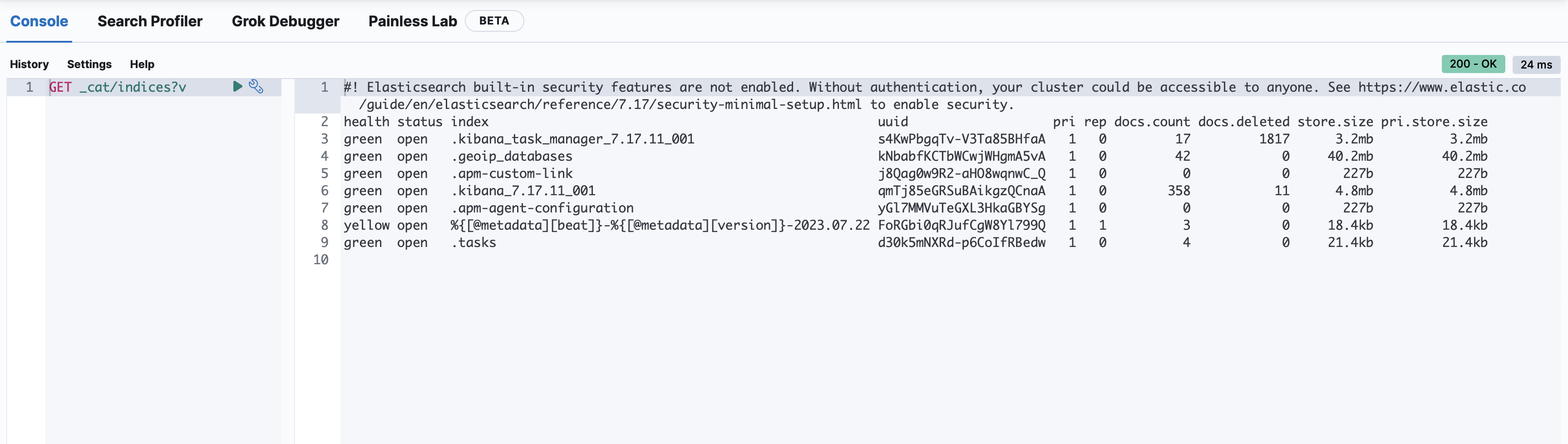여기서 아래 명령어를 입력해서 Elasticsearch에 추가된 인덱스 목록을 확인할 수 있습니다. (실행은 초록 삼각형)