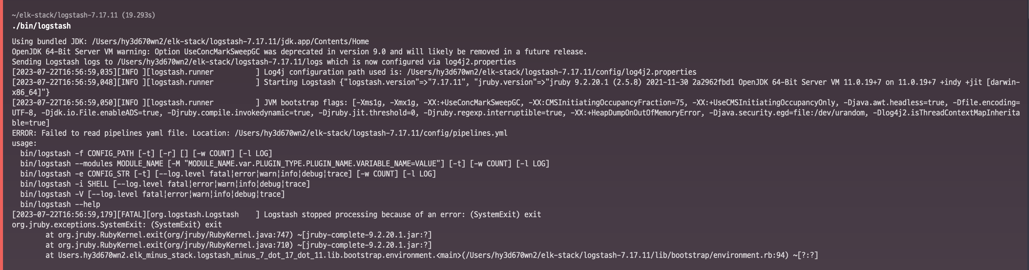 에러 로그를 읽어보니 config/pipelines.yml 파일을 읽을 수 없어서 발생한 문제라고 합니다.