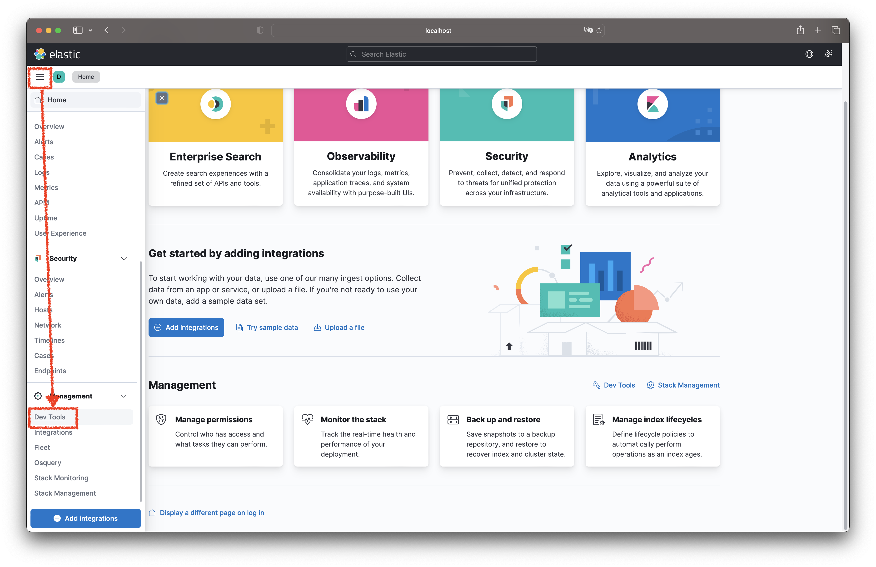 Kibana에서 제공해주는 일부 기능들을 살펴봅시다. Kibana에는 다양한 기능이 있지만, 왼쪽 햄버거 버튼 > Management > Dev Tools에 들어가면 Elasticsearch에 명령을 직접 날릴 수 있는 Playground스러운 화면이 나옵니다. 이걸 사용해봅시다.