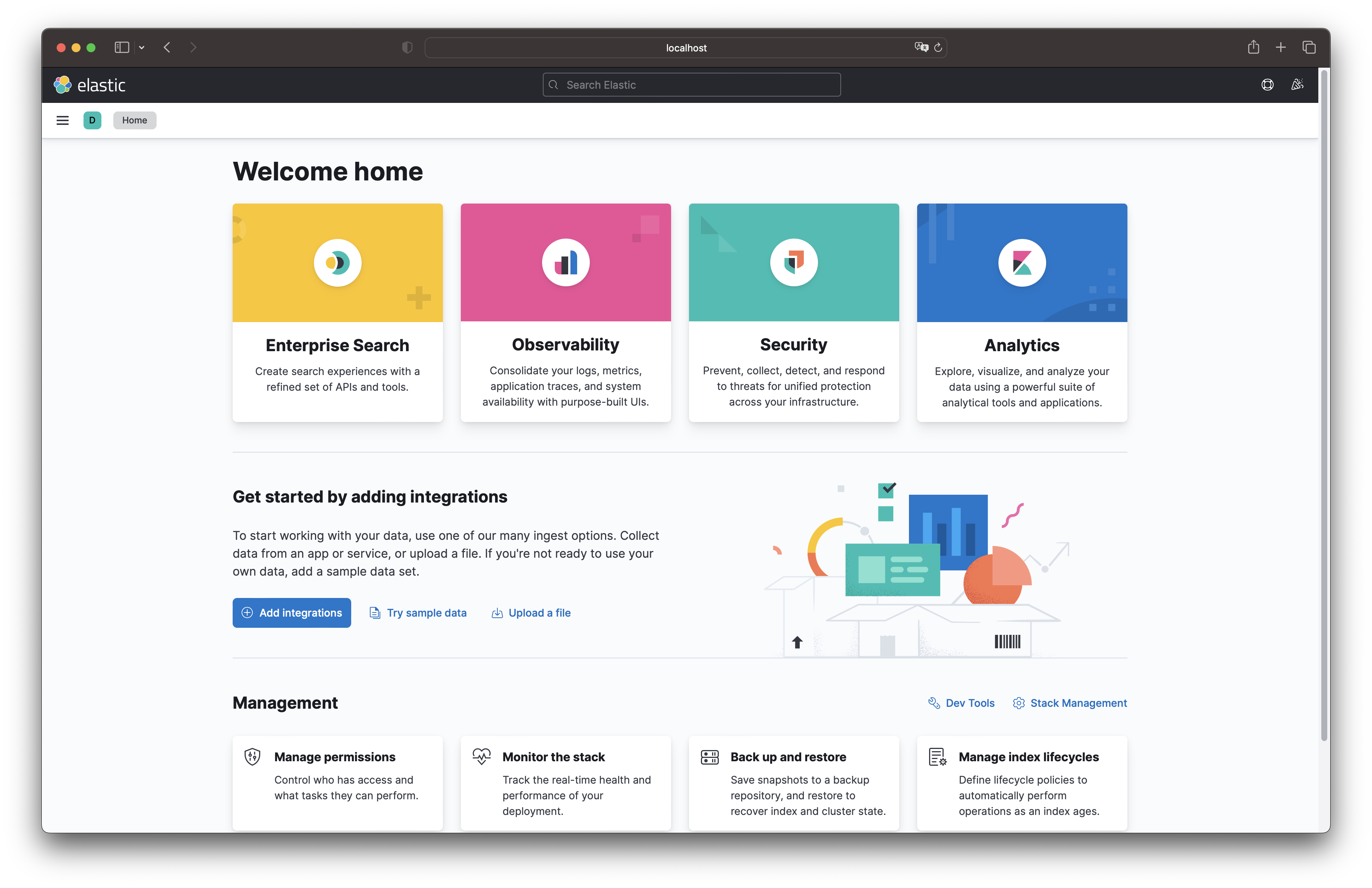 브라우저 주소창에 http://localhost:5601 을 입력하고 접속해봅시다. 아래와 같이 예쁜 화면이 나오면 성공! 입니다.