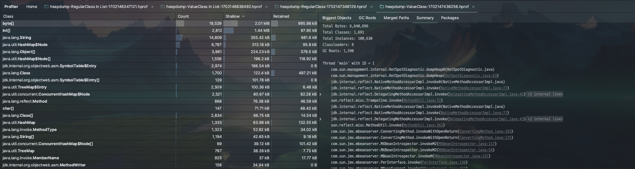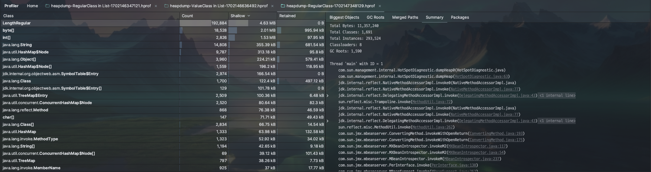 - JVM Heap dump를 분석한 결과, value class가 일반 클래스에 비해 약 58%의 공간만 차지했습니다.