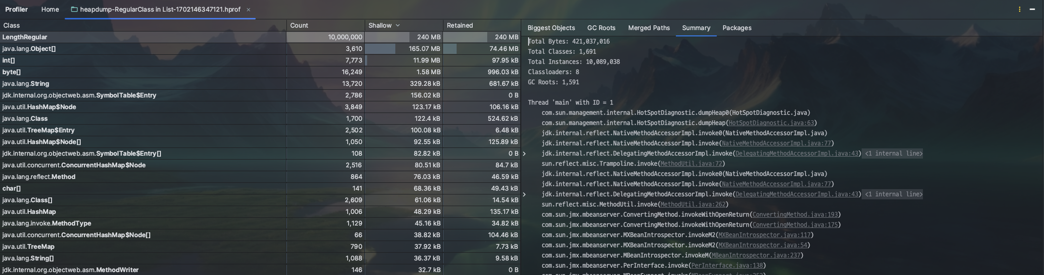 LengthRegular 객체 1000만 개가 생성됐고 힙에 생성된 총 바이트는 421,037,016 Byte입니다.