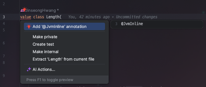 `class Length` 에서 `@JvmInline value class Length` 로 바꿔주면 끝납니다!