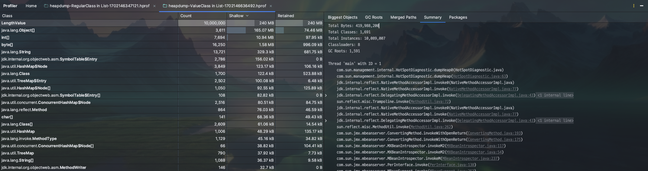 마찬가지로 LengthValue 객체가 1000만 개 생성됐고 Heap에 생성된 총 바이트는 419,988,200 Byte입니다.
