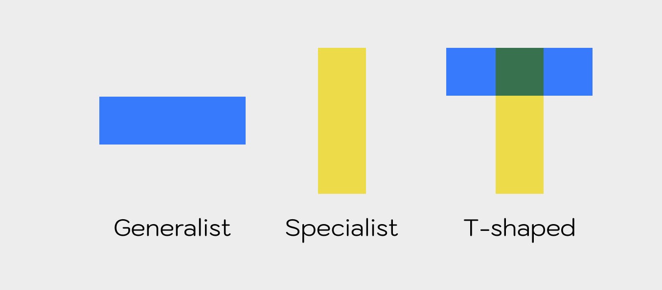 일반적으로 "T자형 인재"는 다양한 분야를 기초 정도로 알고 있는 제너럴리스트(Generalist)와 본인의 분야를 차별점 있게 잘하는 스페셜리스트(Specialist)가 결합된 형태를 의미합니다. 전문 분야에 대해 끊임없이 탐구하면 스페셜리스트가 될 수 있는 것은 알고 있지만, 제너럴리스트는 기준이 모호했고 나만의 기준을 세워도 좋겠다는 생각이 들었습니다.