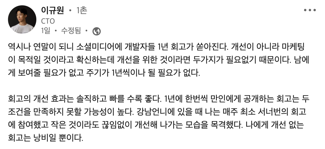 어디선가 "연말 회고는 진정한 회고가 아니라 PR 목적이다"라는 글을 읽은 적이 있습니다. 그래서 "이 글은 진정한 회고일까?" 생각해 봤습니다.