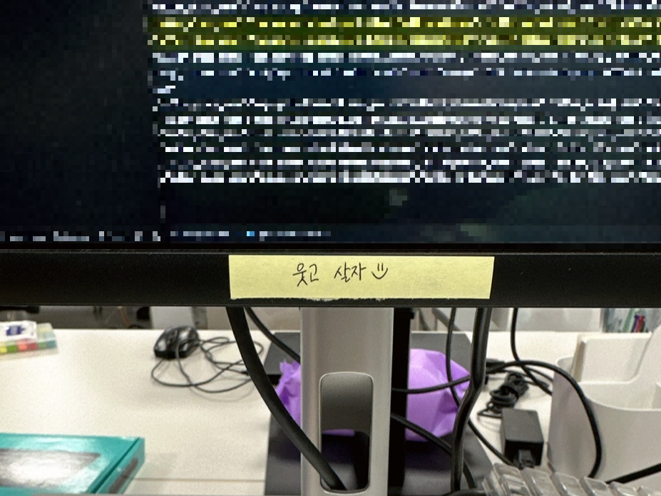 팀원들도 들어가 있는 공개 채널인데 화난 모습을 보여줬다는 사실이 너무 부끄럽게 느껴졌습니다. 누구나 화나보이는 사람에게 말을 걸기 싫어합니다. 부탁을 해야 하는 상황이라면 더욱 부담스럽습니다. 잘못된 행동이라는 것을 깨닫자마자 바로 슬랙 채널을 나왔습니다. 다시는 들어갈 일도 없을 것입니다. 그리고 모니터 한편에 "웃고 살자"라는 문구를 적어서 붙였습니다. ^^