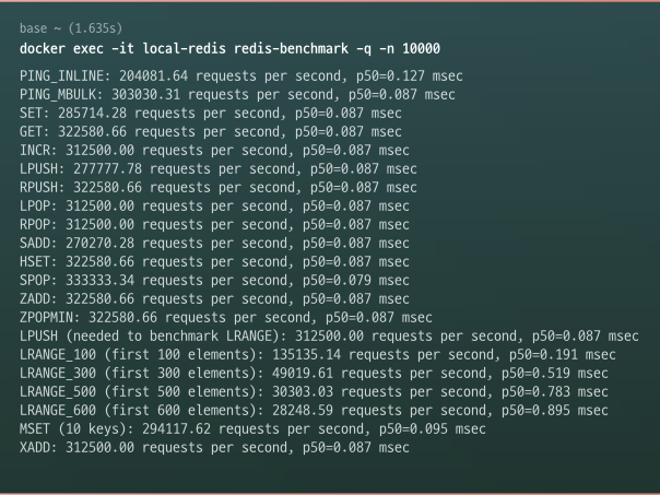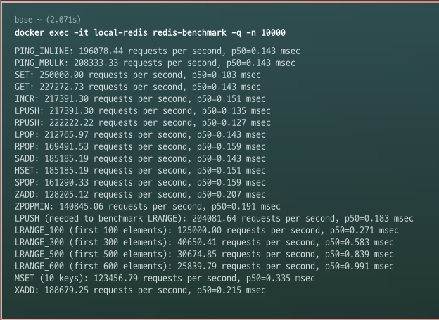 우선 redis-benchmark를 사용해서 다양한 명령어를 10,000번 수행해 봤습니다.