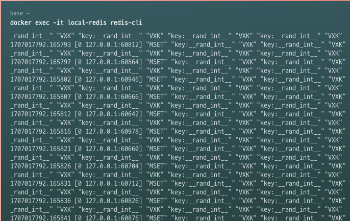 모니터링 세션이 열리고, 연결된 Redis에 입력되는 모든 명령을 스트리밍 해서 출력합니다.