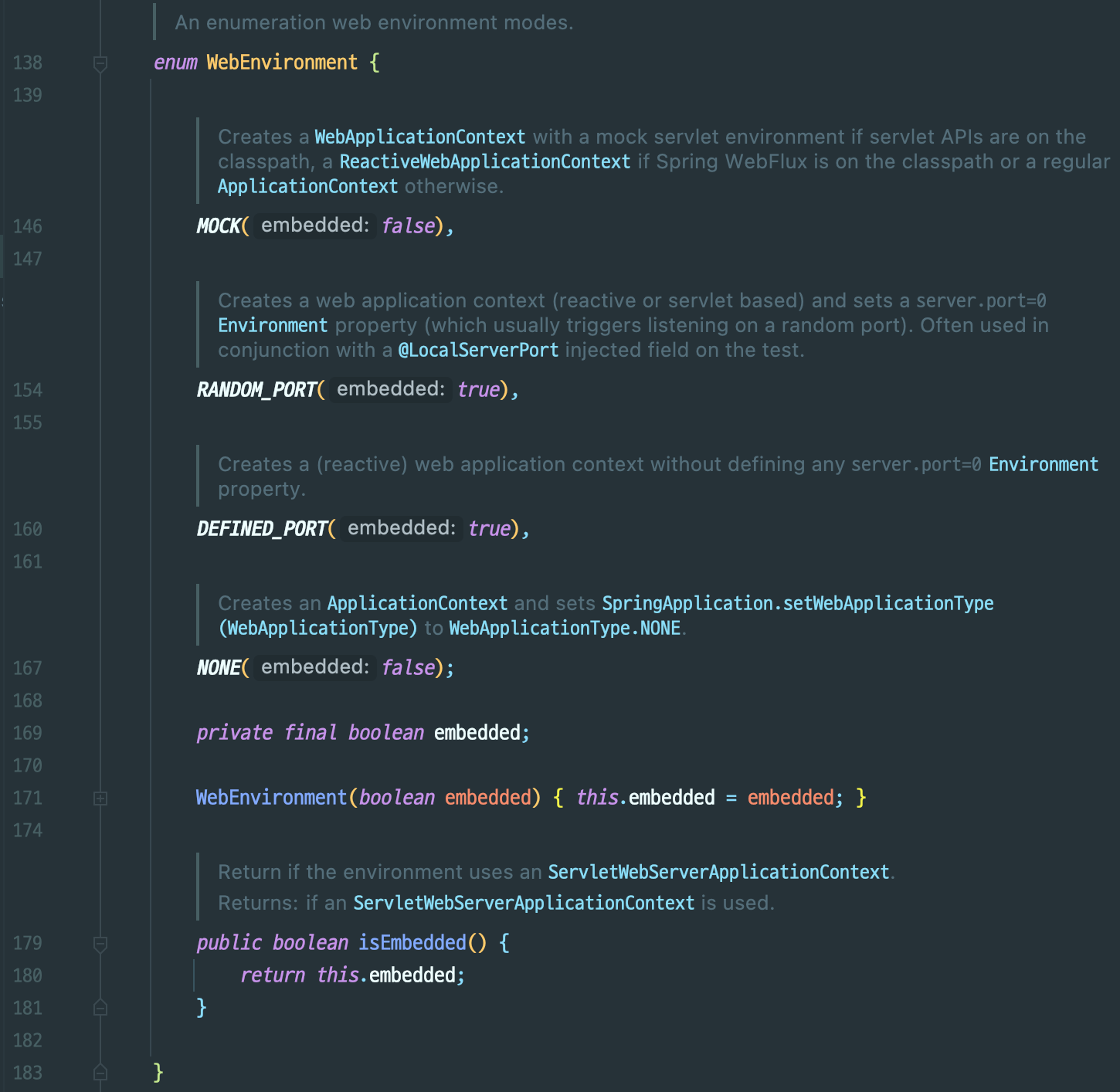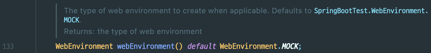 WebEnvironment 라는 필드를 가지고 있고, 디폴트 값으로 WebEnvironment.MOCK 값을 가집니다.
