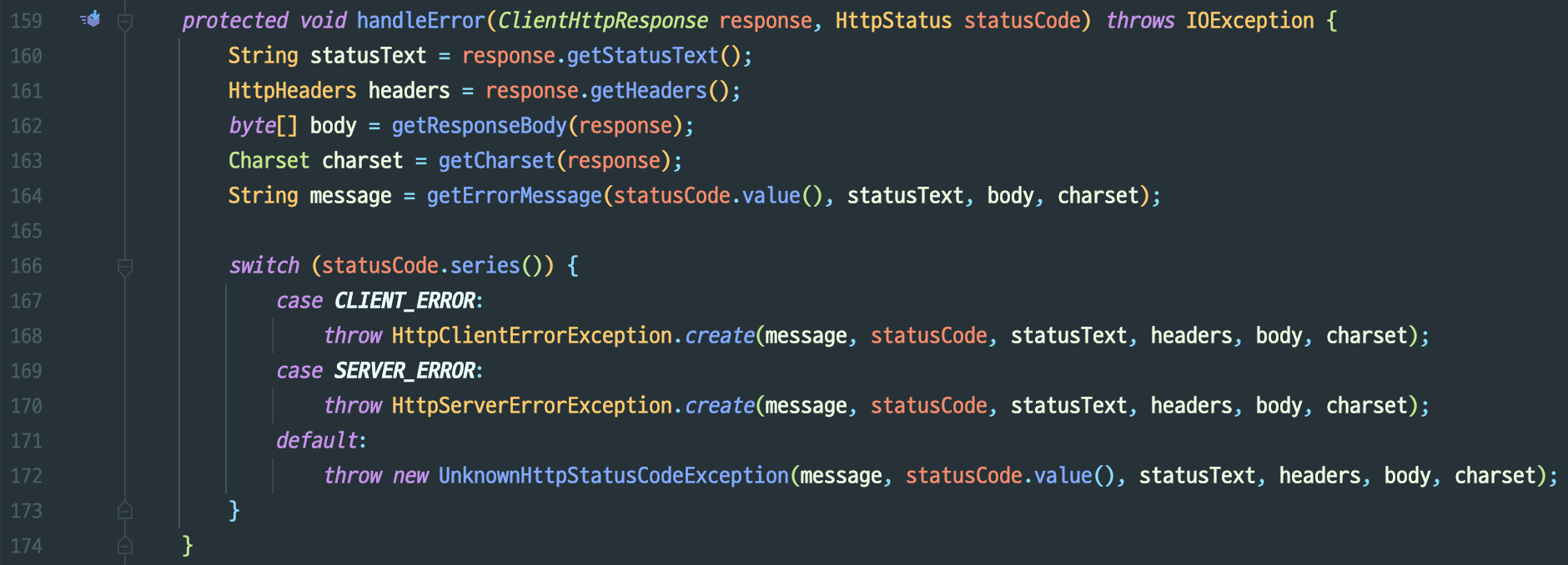 - response body의 내용이 아무 조건도 만족하지 못한다면, DefaultResponseErrorHandler로 처리를 위임하도록 했습니다. 그러면 HttpClientErrorException 혹은 HttpServerErrorException이 발생하겠죠.